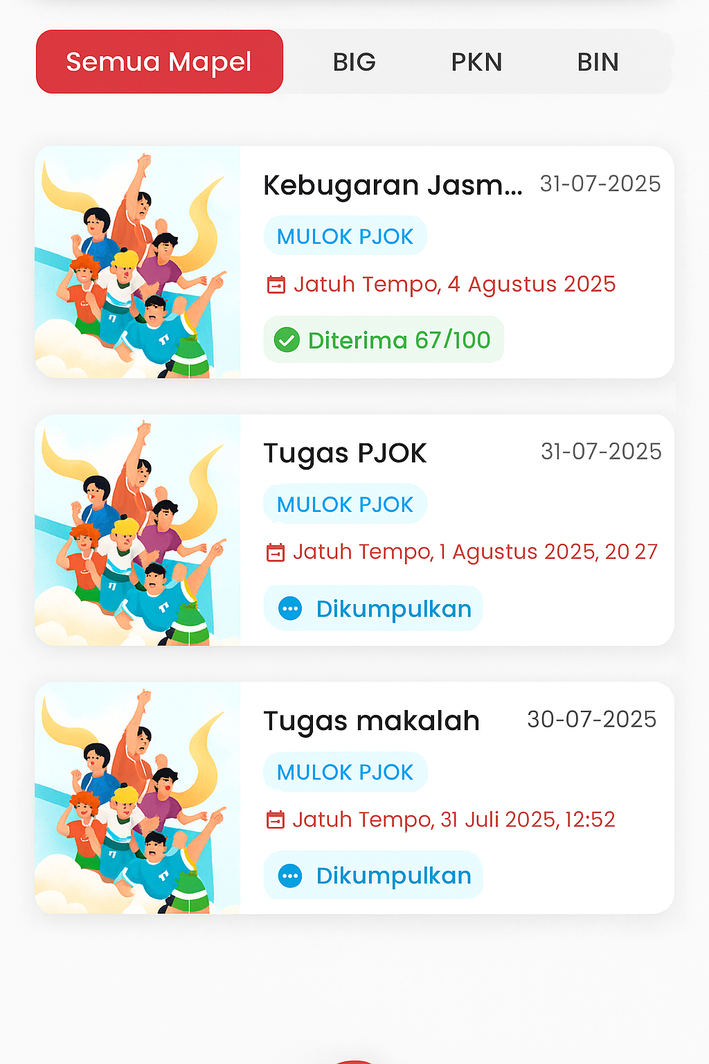 Subject Filter: Students can select "All Subjects" or directly filter by subjects such as BIG, PKN, BIN, and others to focus on specific assignment searches.