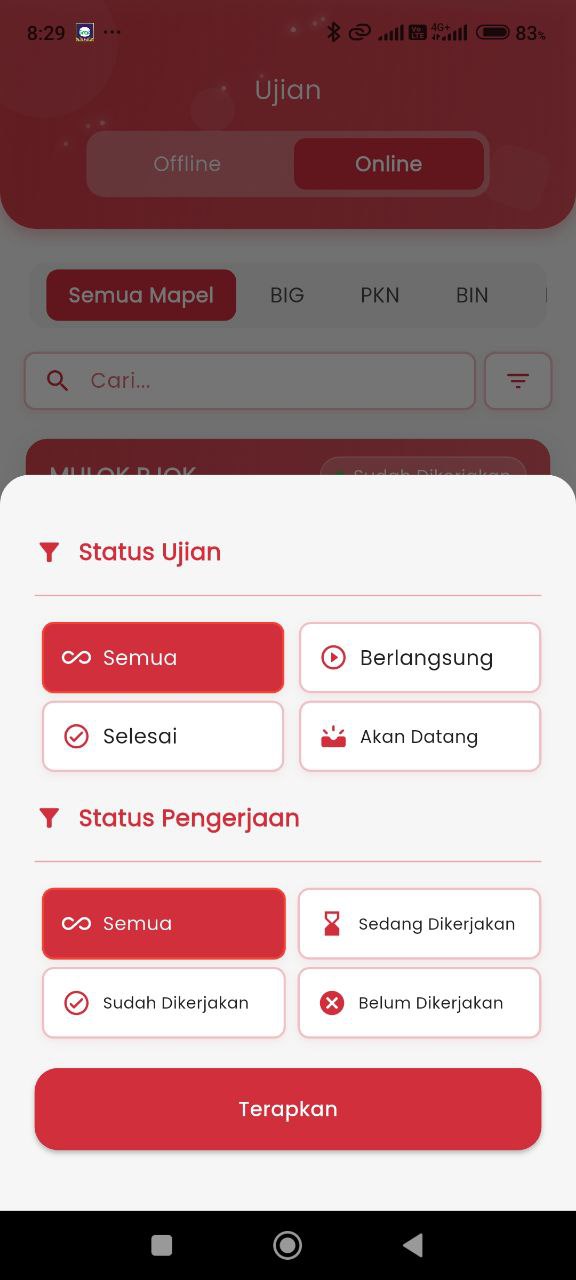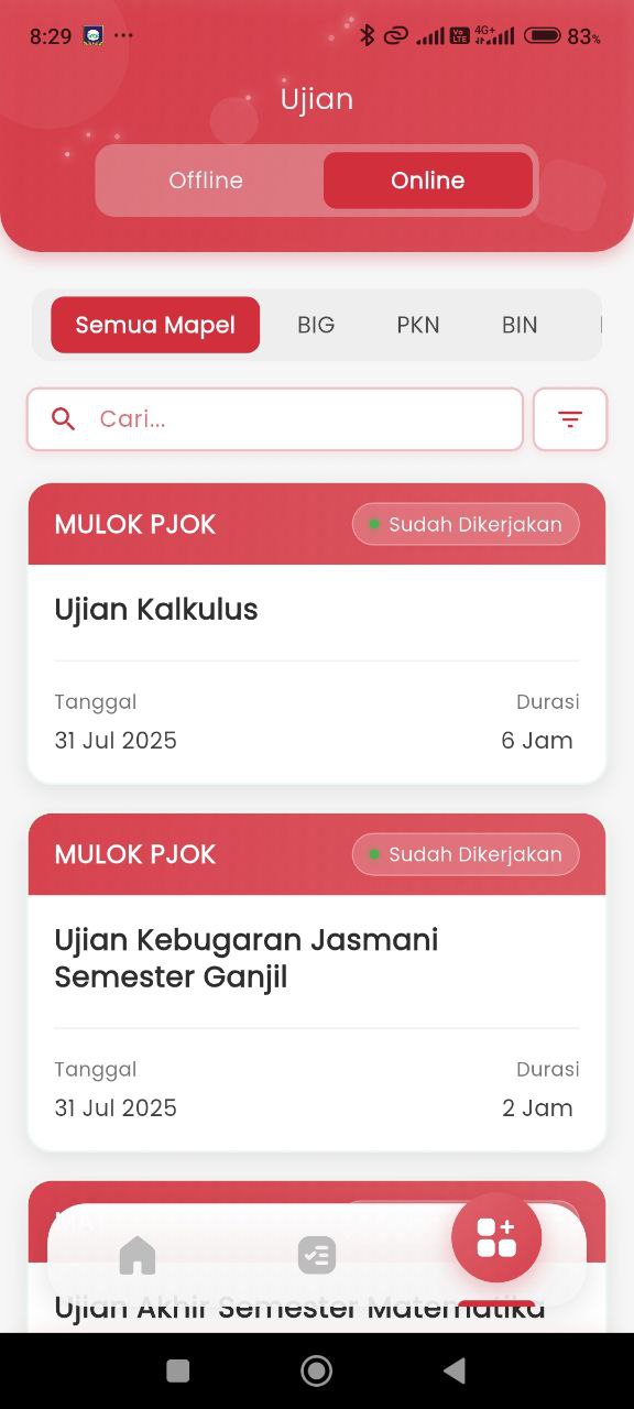 This feature is designed to provide ease for students in monitoring online exam activities that will be/are being held or have been held. The exam display is divided into two main categories: Offline and Online. In this context, users are on the Online tab.