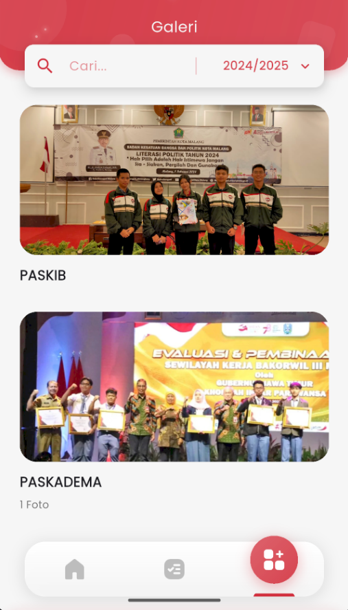 Each activity is displayed in card format with:- Activity title (e.g.: PASKIB, PASKADEMA)