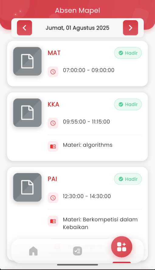 The Subject Attendance page is designed to display students' attendance history in detail based on each subject followed on a given day. This information is presented in real-time and structurally, making it easier for students to monitor their involvement in daily learning.
